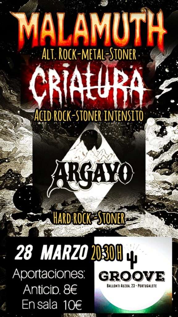 El sábado 28 de marzo en la Groove de Portugalete se encuentra programada una enérgica velada de tres bandas que fusionan estilos y que se mueven en el rock ácido, el hard rock, el stoner y el metal. Cada una con más orientación hacia algunos de estos estilos pero las tres con un marcado carácter enérgico.